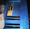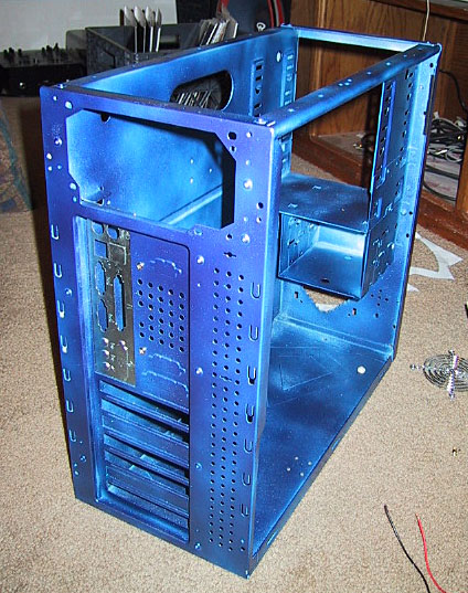 Well to start I picked up a few cans. I got a can of primer, some metallic blue, and yellow. The metallic blue was for the inside of the case. I primed it with 2 coats, sanded lightly, out it in the shower to wash it down, and let it dry. I came back 12 hrs later and painted the first coat of blue. Then waited 24 hrs and painted it again, shown Below: