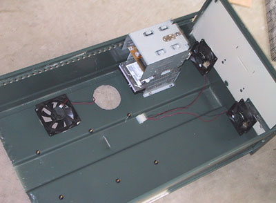 Next I had to figure out how I would make everything work. So I went and took apart an OLD computer case... like a 486 computer case. I took out two 3.5" holders. This will give enough expansion slots for future hard drives and the floppy disk. I also took out the 5.25" drive holder to mount the cdrom. Below is a picture after I drilled the fan holes and mounted the 3.5" holders.